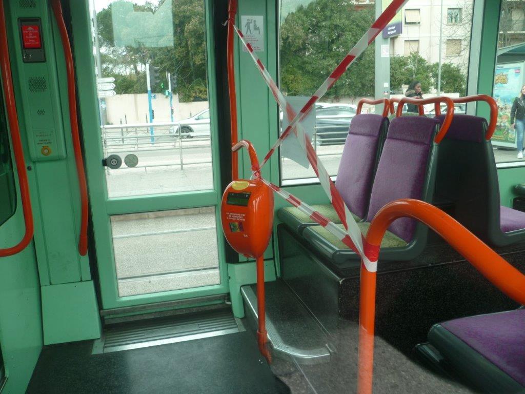 Epidémie de Covid-19 oblige, depuis le lundi 16 mars 2020, date de la photo, dans toutes les rames de tramway du réseau TaM Montpellier 3M, l’accès et la descente par les portes à un vantail de chaque motrice de bout de rame est désormais interdit à la clientèle jusqu’à nouvel ordre. Copyright : Edouard Paris