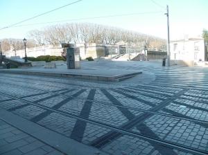 - Des bandes rugueuses antidérapantes dédiées aux bus urbains des lignes 6 et 7 ont été posées sur la place d’Aviler à Montpellier à la veille des élections municipales. Photo prise le dimanche 15 mars 2020. Copyright : Edouard Paris