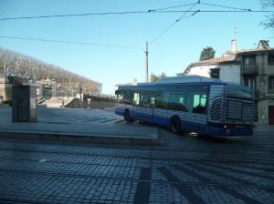 - Place d’Aviler à Montpellier, virage très serré pour un bus opérant sur la ligne 7 en direction de « Hôtel du Département », le dimanche 15 mars 2020. Copyright : Edouard Paris