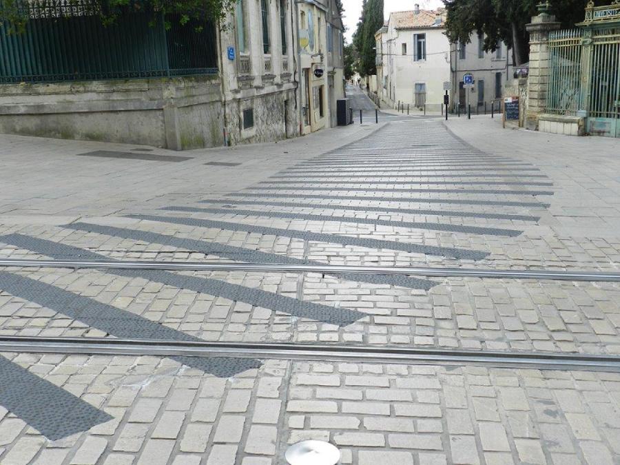 Dans le haut de la rue du Faubourg Saint-Jaumes à Montpellier, photographie des bandes rugueuses antidérapantes dédiées aux bus urbains des lignes 6 et 7 circulant respectivement en direction de « Euromédecine » et « Hôtel du Département ». Cliché en date du vendredi 31 janvier 2020. Copyright : Anje34