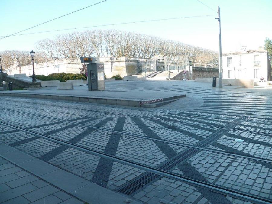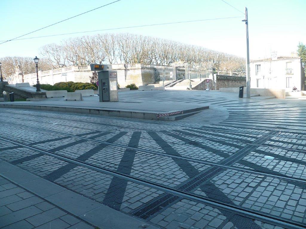 Des bandes rugueuses antidérapantes dédiées aux bus urbains des lignes 6 et 7 ont été posées sur la place d’Aviler à Montpellier à la veille des élections municipales. Photo prise le dimanche 15 mars 2020. Copyright : Edouard Paris