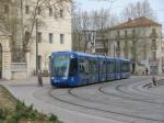 - La rame 2020 Citadis 401 Alstom, opérant sur la ligne 1 en direction du terminus « Odysseum », est photographiée sur la place Albert-1er, le mardi 17 mars 2020 à 11h03, soit moins d’une heure avant l’entrée en vigueur du confinement quasi total imposé pour juguler la pandémie de coronavirus Covid-19. Copyright : Edouard Paris
