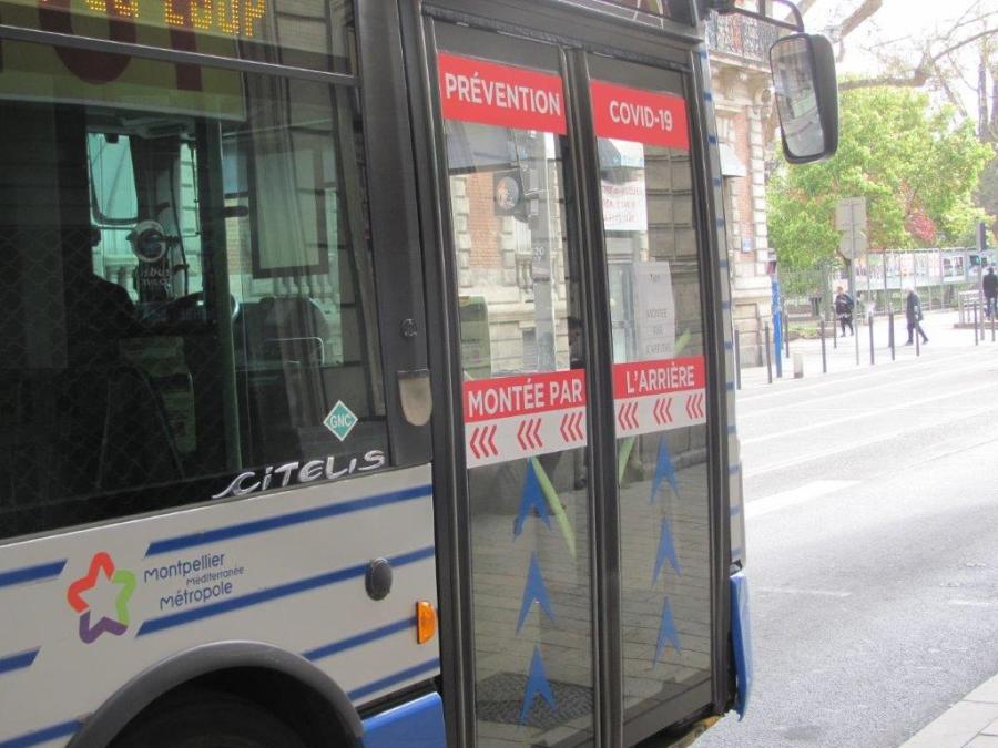 Signalétique appliquée depuis ce mardi 17 mars 2020 sur la porte avant à double vantail d’un bus opérant sur la ligne 6 alors que la mesure est effective depuis le lundi 16 mars à la prise de service. Photo réalisée rue de la République à Montpellier à 10h15. Copyright : Edouard Paris