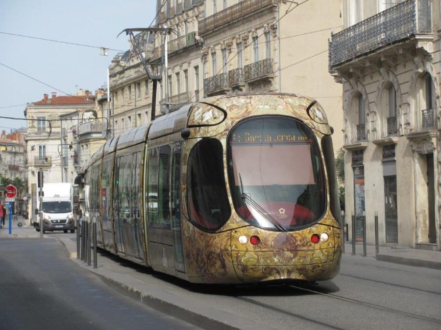 Covid-19 ou pas, les rames opérant sur la ligne 4 offrent toujours une multitudes de places assises en temps ordinaire. Photographie de la rame 2045 Citadis 302 Alstom, rue de la République à Montpellier, le mardi 17 mars 2020 à 10h14. Copyright : Edouard Paris