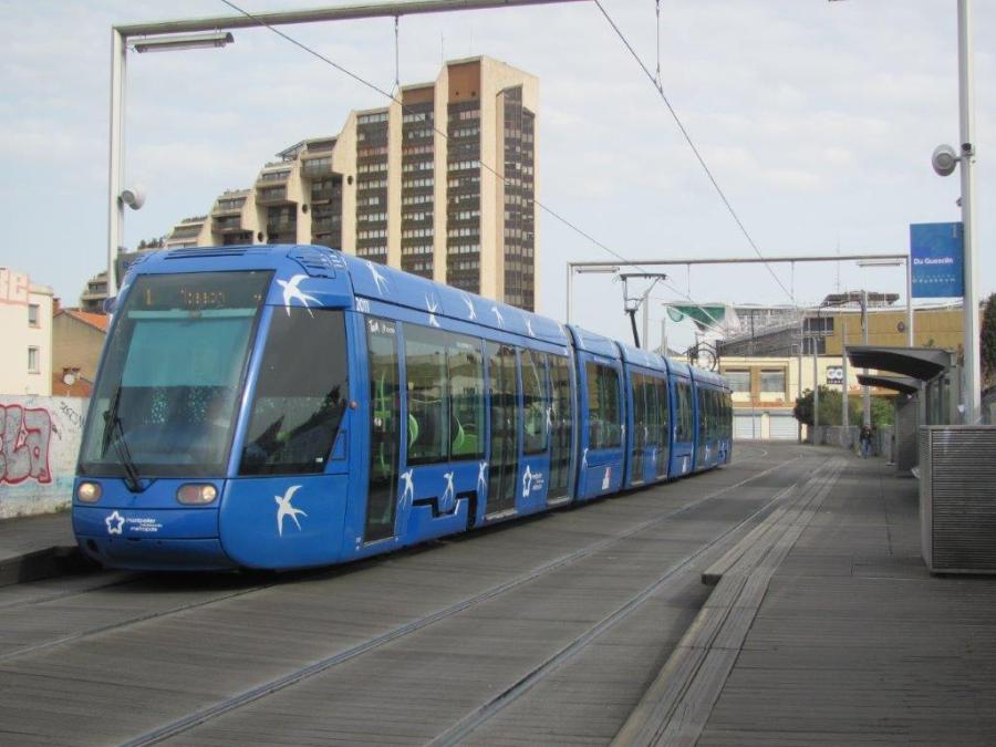 La rame 2011 Citadis 401 Alstom, opérant sur la ligne 1 en direction du terminus « Mosson », est photographiée à la station « Du Guesclin », le mardi 17 mars 2020. Copyright : Edouard Paris