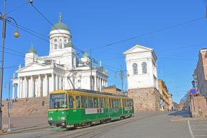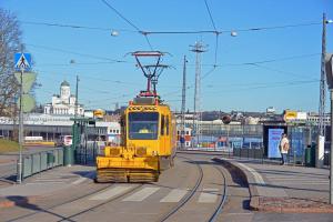 - A Helsinki, la rame 465 MLNRV III Artic Škoda Transtech Oy, opérant sur la ligne 4 en direction du terminus nord-ouest « Munksnäs », est photographiée à toute proximité de la cathédrale orthodoxe Ouspenski, le mardi 25 février 2020. Copyright : Thierry Leleu