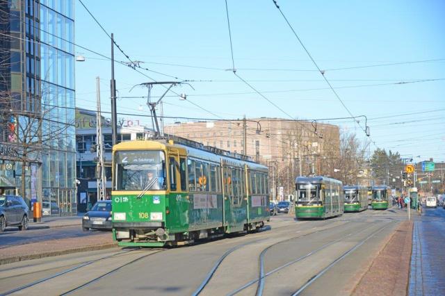 A Helsinki, la rame 108 MLNRV II Valmet, opérant sur la ligne 2 en direction du terminus sud « Olympiaterminalen », est photographiée sur Mannerheimintie quelques instants après avoir quitté la station « Glaspalatset » commune aux lignes 1, 2, 4 et 10, le mardi 25 février 2020. Copyright : Thierry Leleu