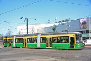 - A Helsinki, la rame 469 MLNRV III Artic Škoda Transtech Oy, opérant sur la ligne 10 en direction du terminus sud « Kirurgi », est photographiée au moment de son passage à la hauteur de la statue équestre du Maréchal Mannerheim, le mardi 25 février 2020. Copyright : Thierry Leleu