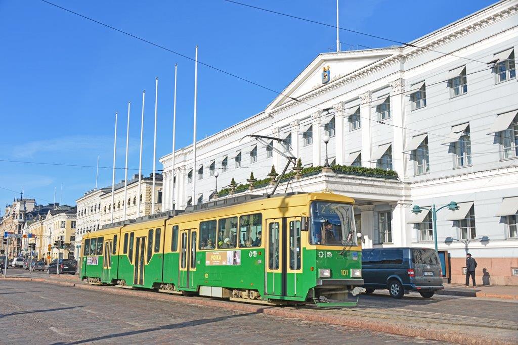 A Helsinki, la rame 101 MLNRV II Valmet, opérant sur la ligne 2 en direction du terminus nord « Pasela », est photographiée à son passage devant l’hôtel de ville, le mardi 25 février 2020. Copyright : Thierry Leleu