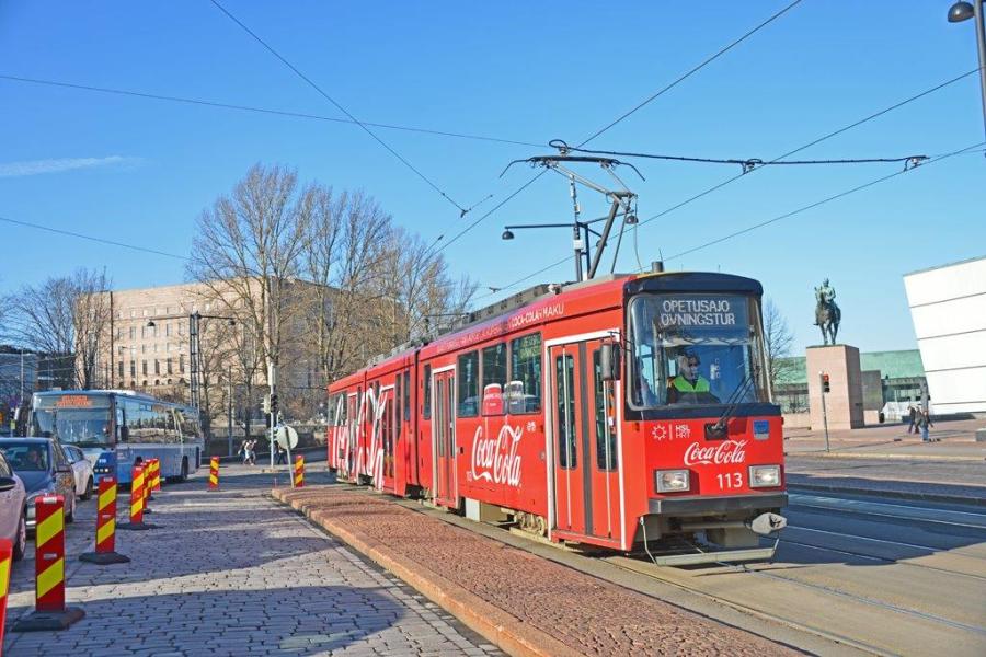 A Helsinki, la rame 113 MLNRV I Valmet, opérant en tant que tramway école, est photographiée juste après son passage devant la statue équestre du Maréchal Mannerheim, le mardi 25 février 2020. Copyright : Thierry Leleu