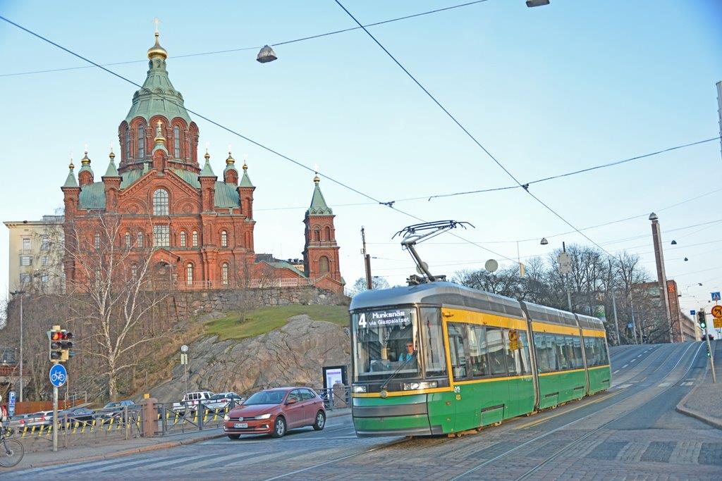 A Helsinki, la rame 465 MLNRV III Artic Škoda Transtech Oy, opérant sur la ligne 4 en direction du terminus nord-ouest « Munksnäs », est photographiée à toute proximité de la cathédrale orthodoxe Ouspenski, le mardi 25 février 2020. Copyright : Thierry Leleu