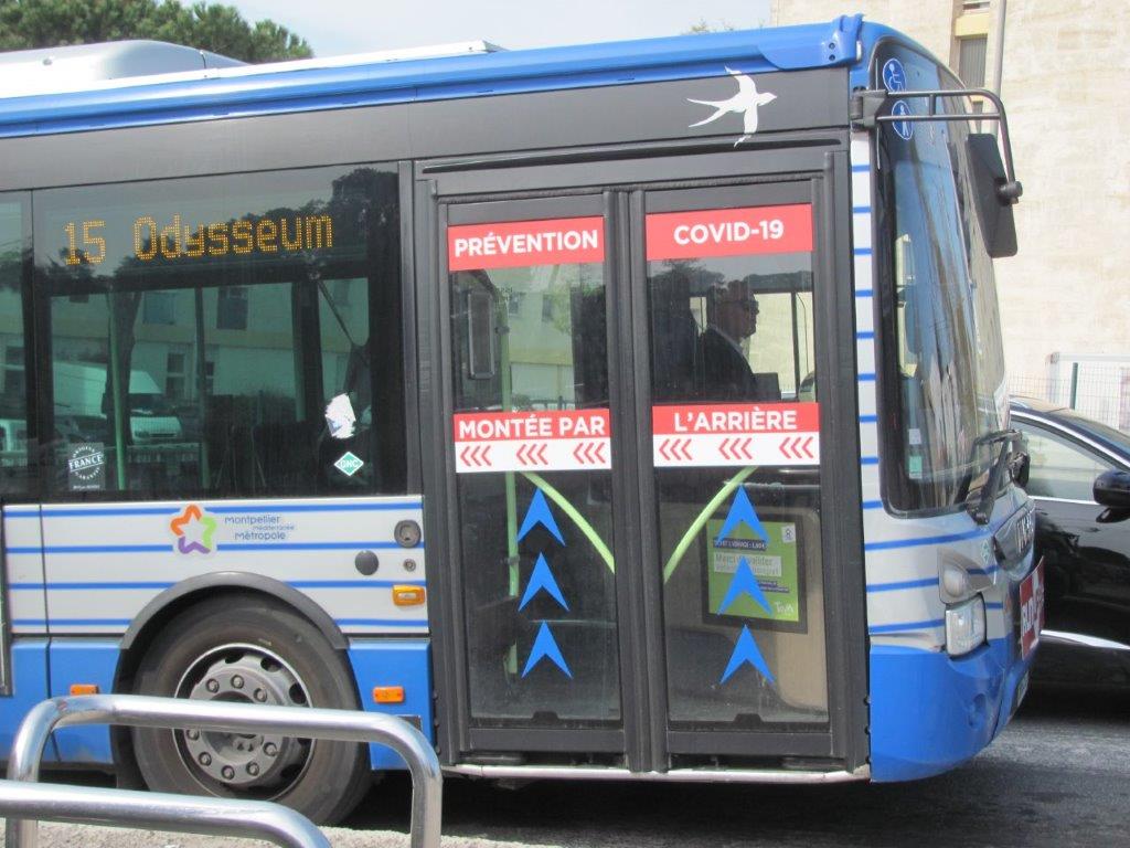 Signalétique « Prévention Covid-19 » appliquée sur une porte à double vantail d’un bus opérant sur la ligne 15 et circulant en direction du terminus « Odysseum », le vendredi 20 mars 2020. Copyright : Edouard Paris