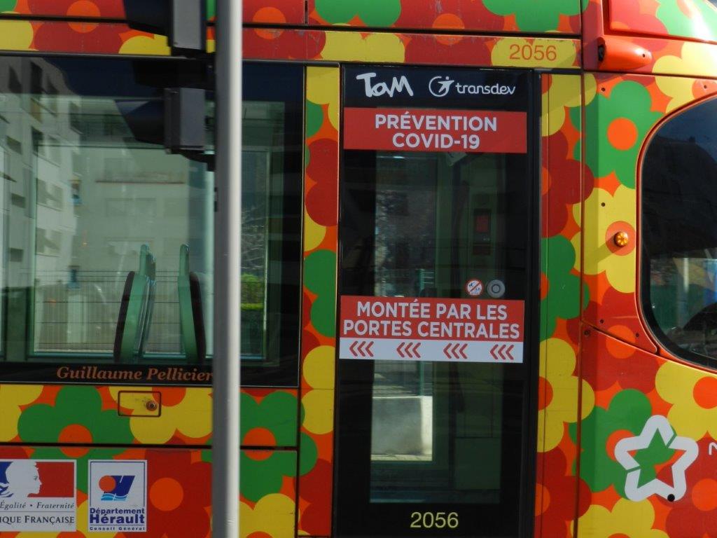 Signalétique initiale « Prévention Covid-19 » appliquée sur l’ensemble des portes à un vantail dont sont équipées chaque motrice des rames de tramway. Sur la photo prise le jeudi 19 mars 2020, celle d’une porte à un vantail d’une des deux motrices de la rame 2056 Citadis 302 Alstom opérant sur la ligne 2. Copyright : Anje34