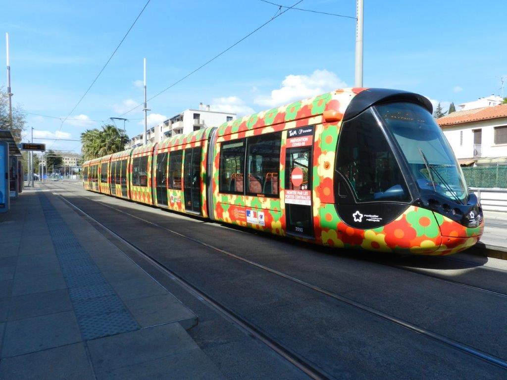 La rame 2093 Citadis 402 Alstom, opérant sur la ligne 2 en direction du terminus « Saint Jean de Védas – Centre », est photographiée à la station « Lemasson » totalement déserte, le samedi 21 mars 2020 à 13h45. Copyright : Anje34