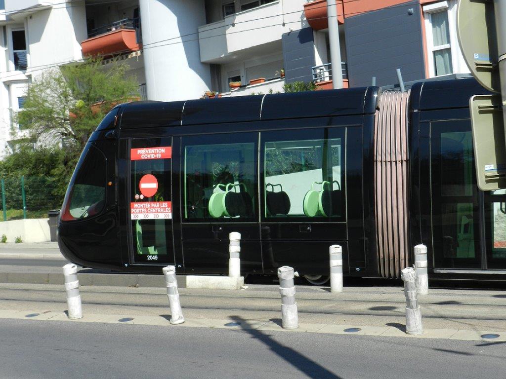 Avenue de Maurin à Montpellier, photographie de la motrice de tête de la rame 2049 Citadis 302 Alstom multiligne, opérant sur la ligne 2 en direction de « Notre-Dame de Sablassou », le samedi 21 mars 2020 à 13h59. Copyright : Anje34