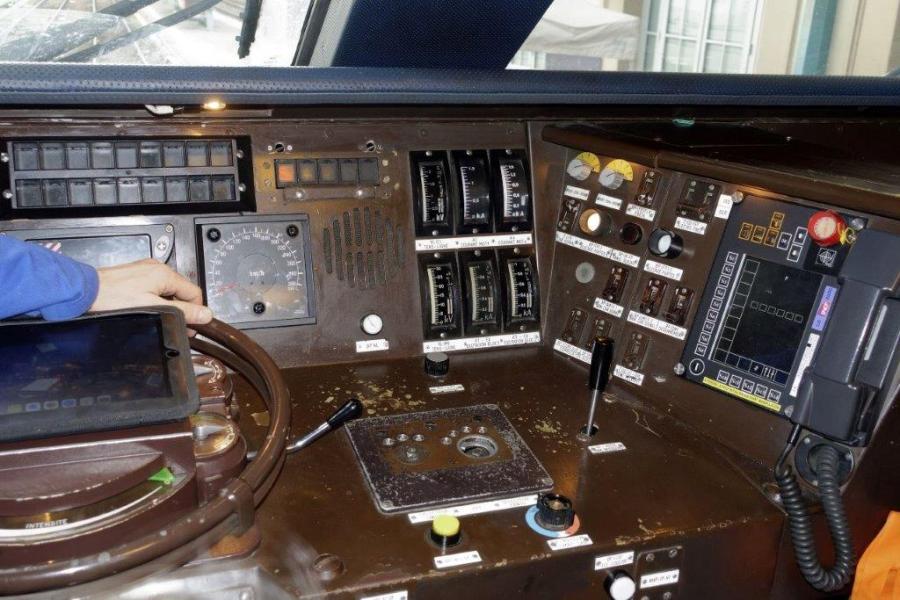 Aperçu d’une partie du tableau de bord de la cabine de conduite de la motrice M1 23001 de la rame TGV PSE 01 dénommée Patrick, en gare de Lyon Perrache, le samedi 7 mars 2020. Copyright : Yvon Brument
