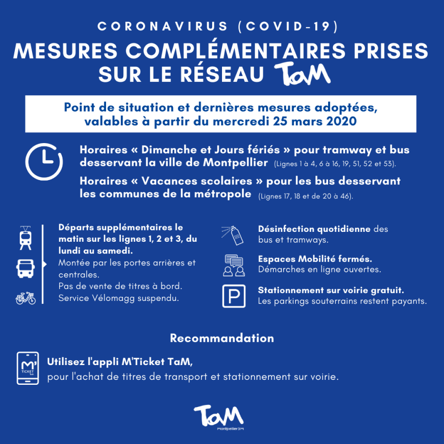 Mesures complémentaires prises sur le réseau TaM Montpellier 3M et valables à compter du mercredi 25 mars 2020. Document TaM Montpellier 3M
