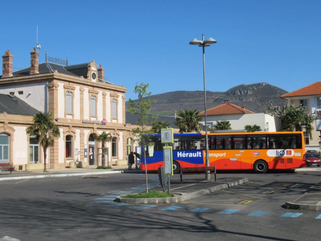 Un autocar liO Hérault Transport est photographié sur la place Francis-Laborde devant la gare de Millau, le mercredi 25 mars 2020, 9e jour de confinement quasi total, pandémie de coronavirus Covid-2019 oblige. Copyright : Michel Bozzola