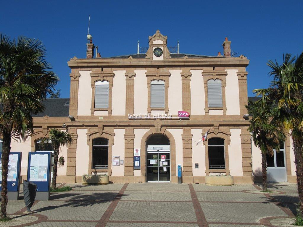 Photographie de la façade de la gare de Millau, côté cour, le mercredi 25 mars 2020 à 10h20, 9e jour de confinement quasi total, pandémie de coronavirus Covid-19 oblige. Copyright : Michel Bozzola