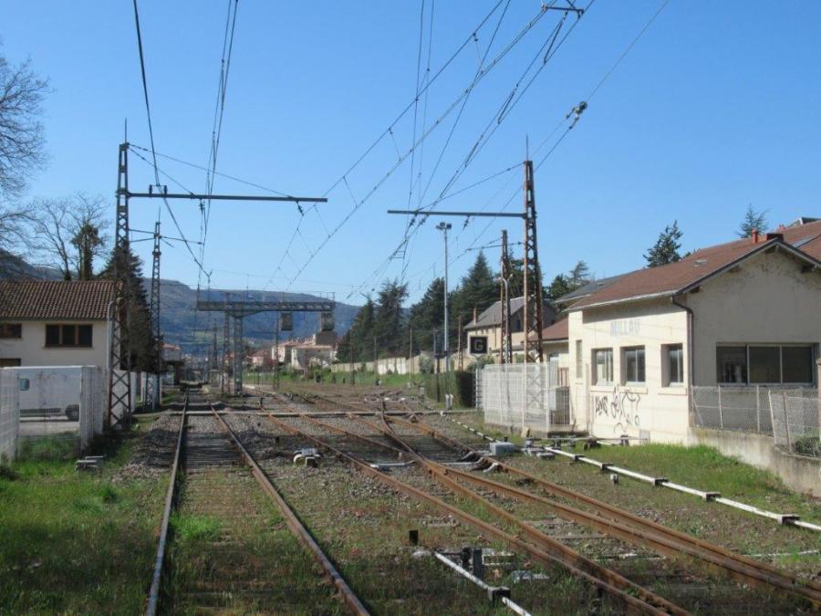 Voies de la gare de Millau photographiées depuis le passage à niveau n° 69, le mercredi 25 mars 2020 à 10h31, 9e jour de confinement quasi total, pandémie de coronavirus Covid-19 oblige. Copyright : Michel Bozzola