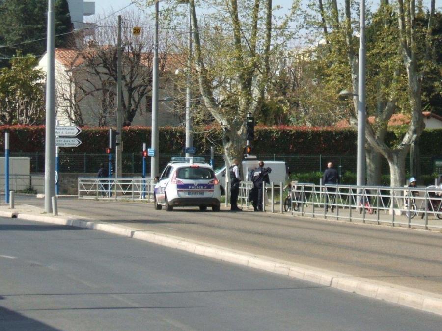 Respect du confinement quasi total pour cause de pandémie de coronavirus Covid-19, les forces de l’ordre veillent au grain comme ici à la hauteur du parc Tastavin à Montpellier, le samedi 28 mars 2020 à 14h58. Copyright : Anje34