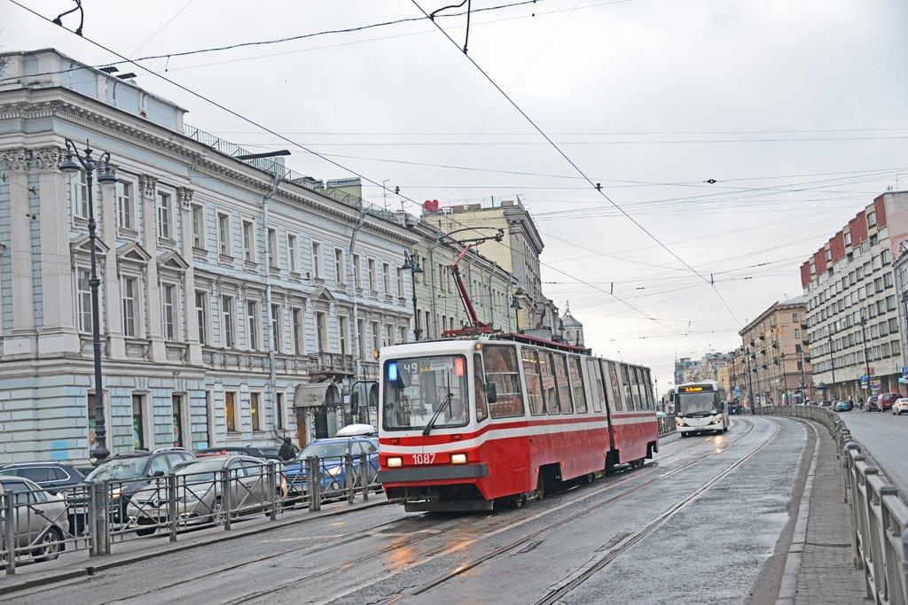 A Saint-Pétersbourg, motrice double caisse 1087 modèle LVS-86K, numéro de série 1231, sortie des ateliers PTMF en janvier 1992 sous le modèle LVS-86T, photographiée sur le site propre de la perspective Ligovsky alors qu’elle opère sur la ligne 49, le lundi 2 mars 2020. Numérotations précédentes selon le dépôt d’affectation : 3055 (06-2002 – 10-2011), 3255 sous le modèle LVS-86T (xx-1992- 06-2002) et 3055 sous le modèle LVS-86T (01-1992 – xx-1992). Copyright : Thierry Leleu