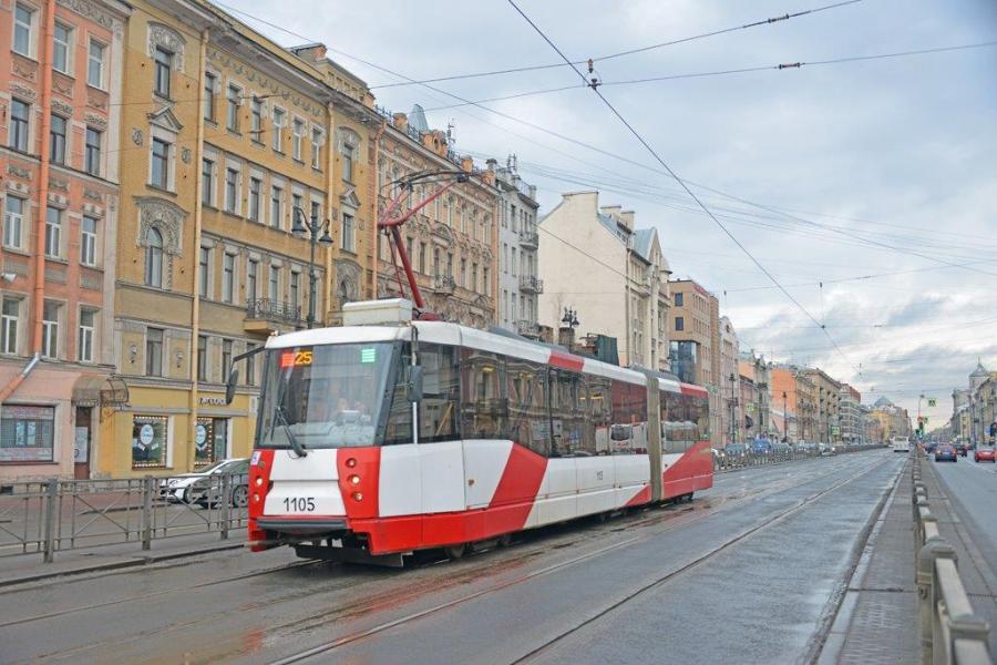 A Saint-Pétersbourg, motrice double caisse 1105 modèle 71-152 (LVS-2005), numéro de série 5, sortie des ateliers PTMF en décembre 2007, photographiée sur le site propre de la perspective Ligovsky alors qu’elle opère sur la ligne 25, le lundi 2 mars 2020. Numérotation précédente selon le dépôt : 1209 (12-2007 – 02-2008). Copyright : Thierry Leleu
