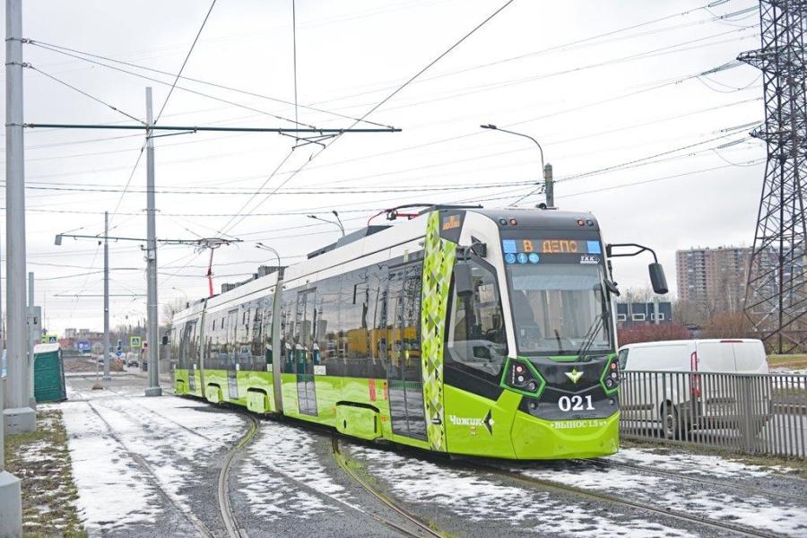 A Saint-Pétersbourg, rame bidirectionnelle 021 Metelitsa B85600M Stadler, sortie de l’unité de Minsk (Bielorussie) en août 2018, appartenant à l’exploitant TKK, photographiée sur une voie dont le chantier de la plateforme est en cours de finition dans le district de Krasnogvardeysky, le lundi 2 mars 2020. Copyright : Thierry Leleu