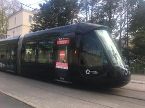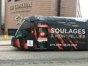 La seconde présente cette même signalétique apposée sur une porte à un vantail de la motrice de tête de la rame 2099 Citadis 402 Alstom multilignes, circulant en direction du terminus « Odysseum », photographiée à la station « Corum », quai commun aux lignes 1 et 4. Si l’exposition Soulages au musée Fabre a fait l’objet d’une prolongation jusqu’au dimanche 29 mars 2019, il se trouve que ce même musée a fermé ses portes le samedi 14 mars en fin d’après-midi pour une durée indéterminée, pandémie de coronavirus Covid-19 oblige.