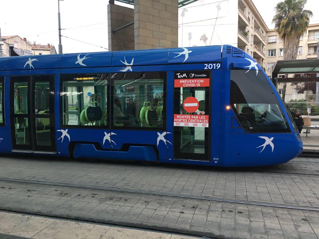 Signalétique « Prévention Covid-19 » appliquée sur une porte à un vantail de la motrice de queue de la rame 2019 Citadis 401 Alstom, circulant en direction du terminus « Mosson », photographiée à la station « Corum », quai commun aux lignes 1 et 4, le mardi 31 mars 2020. Copyright : En passant par là
