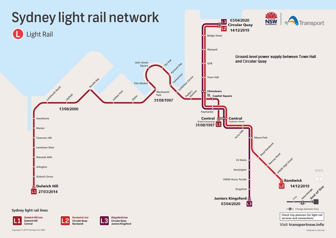 Plan du réseau de tramways de Sydney actualisé le vendredi 3 avril 2020. Document Transport for NSW