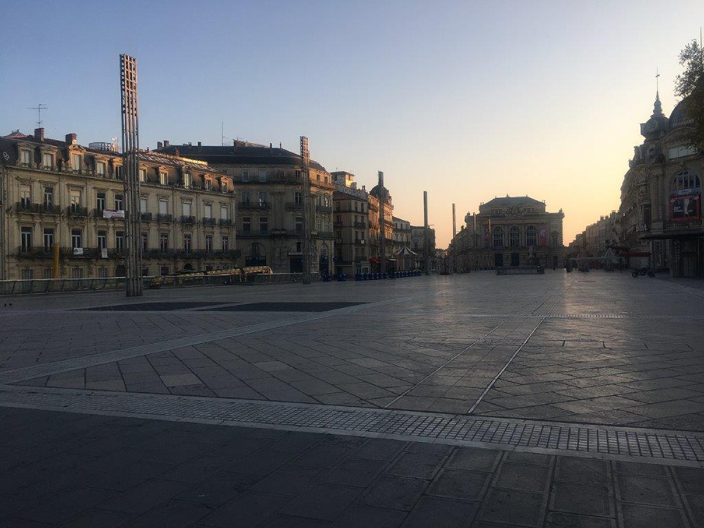 Photographie de la place de la Comédie de Montpellier au 20e jour de confinement quasi total pour cause de pandémie de coronavirus Covid-19, le dimanche 5 avril 2020 à 19h32. Copyright : En passant par là