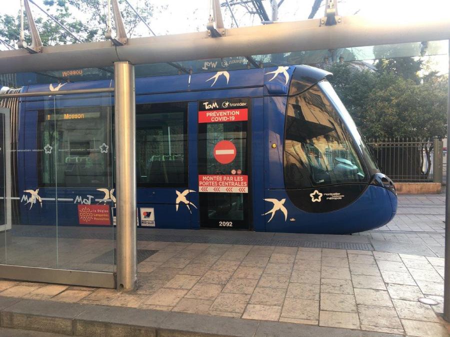 Signalétique « Prévention Covid-19 » appliquée sur une porte à un vantail d’une des deux motrices de la rame 2092 Citadis 402 Alstom opérant sur la ligne 1 à la station « Gare Saint-Roch », rue Maguelone à Montpellier, commune aux lignes 1 et 2. Photo prise le dimanche 5 avril 2020 en début de soirée. Copyright : En passant par là