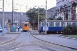 - A Rome, la motrice double caisse 7023 OMS, opérant sur la ligne 516, et la motrice 2137 MRS C&T, opérant sur la ligne 14, sont photographiées à l’arrêt « Farini », le jeudi 20 mai 1982. Copyright : jean-pierre autié
