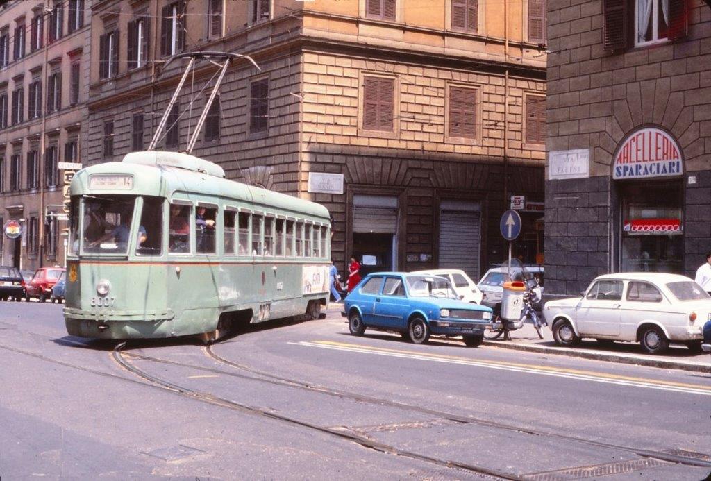A Rome, la motrice 8007 PCC OM (année 1957), opérant sur la ligne 14, est photographiée au moment où elle entre sur la via Farini, le jeudi 20 mai 1982. Copyright : jean-pierre autié