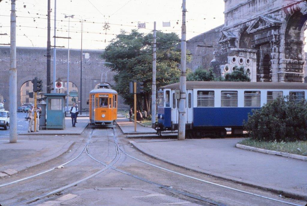 A Rome, piazza Labicano, vue sur le croisement des voies à l’écartement 950 mm de la ligne « Roma – Giardinetti » et de celle à l’écartement 1 445 mm commune aux lignes 14, 19, 30/ et 516 du réseau de tramways romain, le jeudi 20 mai 1982. Copyright : jean-pierre autié