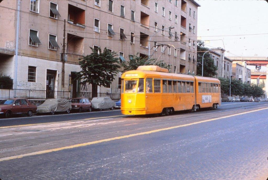 A Rome, la motrice double caisse 7023, opérant sur la ligne 516, est photographiée sur la via Prenestina alors qu’elle circule en direction de la Porta Maggiore, le jeudi 20 mai 1982. Copyright : jean-pierre autié