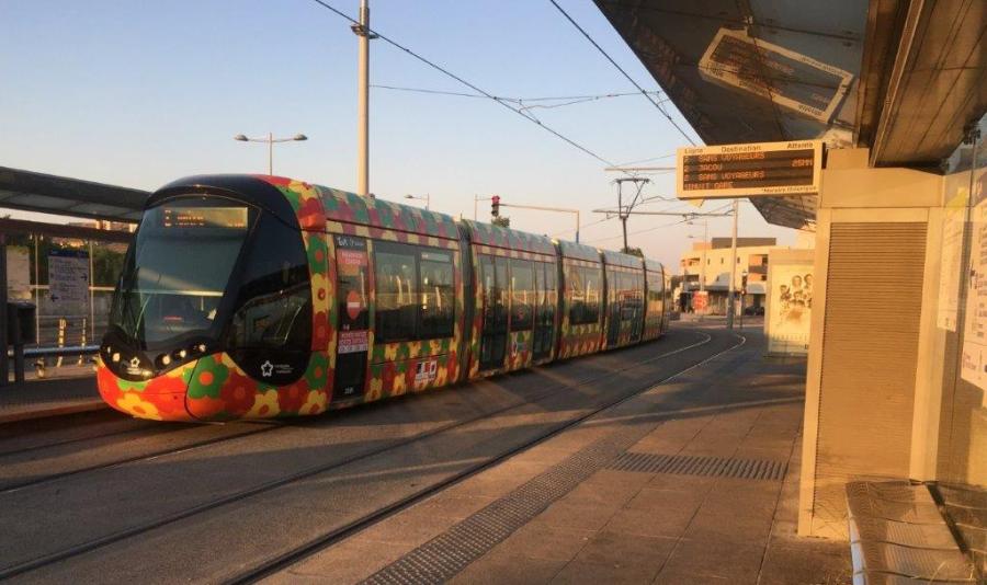 La rame 2094 Citadis 402 Alstom, opérant sur la ligne 2 en direction du terminus « Saint Jean de Védas – Centre », est photographiée à la station « Notre-Dame de Sablassou », commune de Castelnau-le-Lez, le vendredi 10 avril 2020, 25e jour de confinement quasi total pour cause de pandémie de coronavirus Covid-19. Copyright : En passant par là