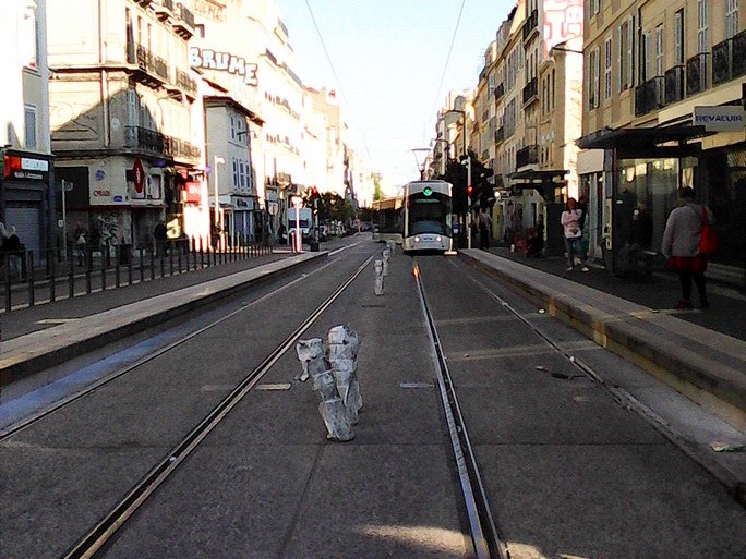Rue de Rome à Marseille, une rame Flexity Outlook Bombardier approche du terminus « Castellane » du T3, le mercredi 15 avril 2020, 30e jour de confinement quasi généralisé pour cause de coronavirus Covid-19. Copyright : Adriana Venier