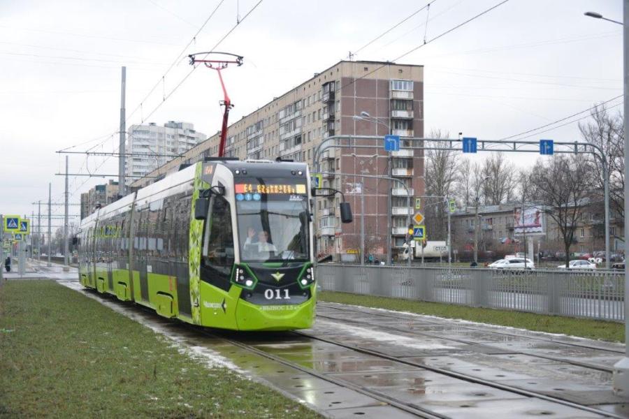 A Saint-Pétersbourg, district de Krasnogvardeysky, la rame 011 Metelitsa B85600M Stadler Minsk, opérant sur la ligne 64 et circulant en direction du terminus « Ladozhskaya (gare et métro) », est photographiée avenue Nastavnikov sur le tronc commun des lignes 59, 63 et 64 du réseau «Chizhik» TKK quelques instants après avoir quitté la station « Prospekt Udarnikov », le lundi 2 mars 2020. Copyright : Thierry Leleu
