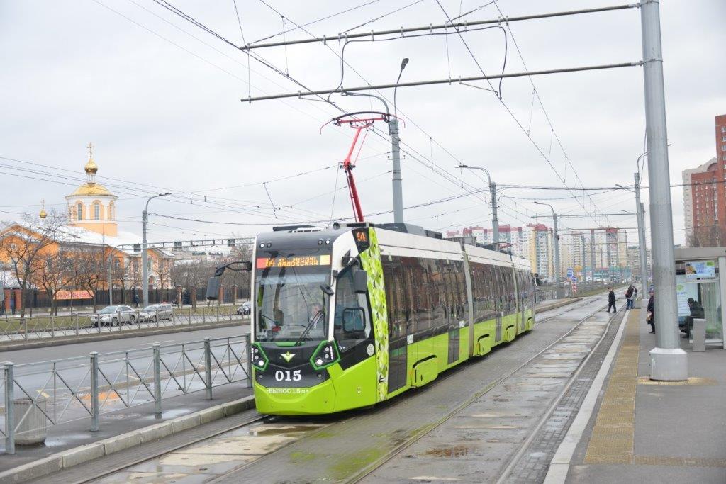 A Saint-Pétersbourg, district de Krasnogvardeysky, avenue Kosygina, la rame 015 Metelitsa B85600M Stadler Minsk, opérant sur la ligne 64 et circulant en direction du terminus « Ladozhskaya (gare et métro) », est photographiée au moment où elle quitte la station aux quais décalés « Rue Peredovikov », commune aux lignes 8, 59, 63 et 64 du réseau «Chizhik» TKK, le lundi 2 mars 2020. Copyright : Thierry Leleu
