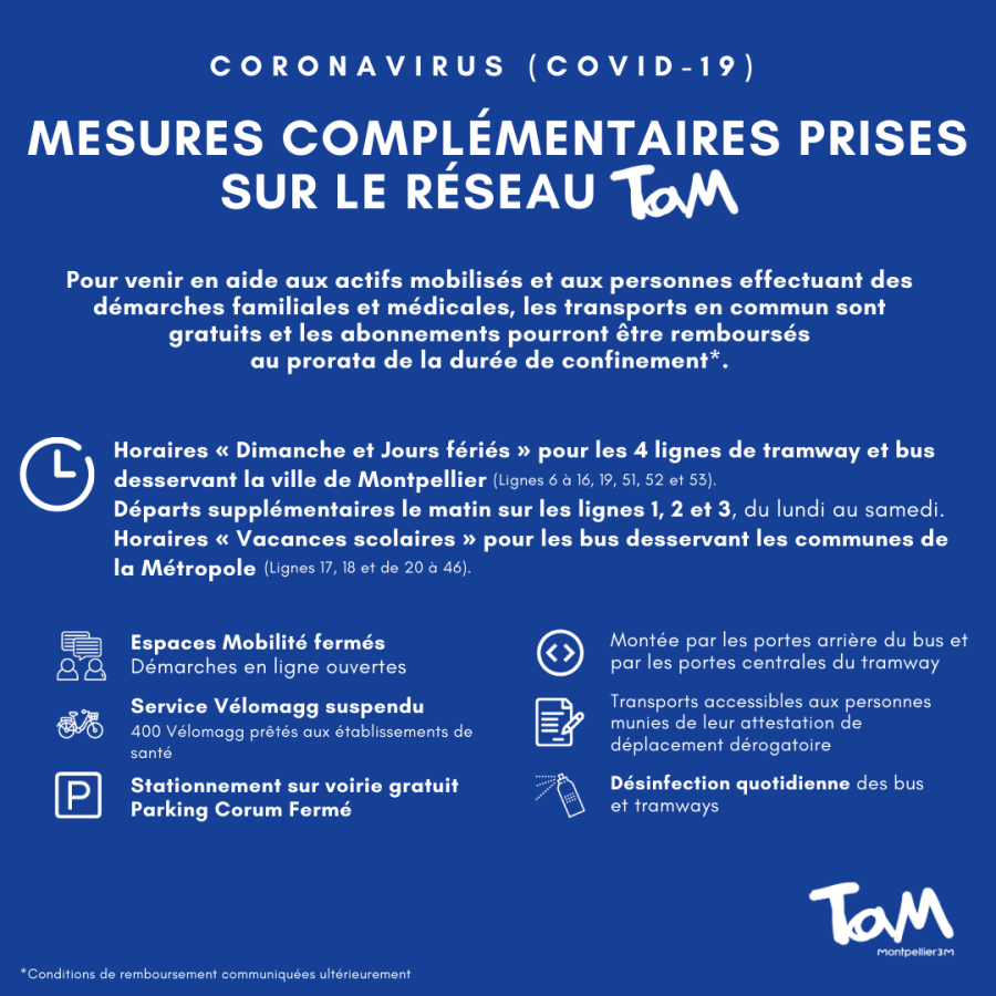 Pandémie de coronavirus Covid-19 oblige, mesures complémentaires prises sur le réseau TaM Montpellier 3M actualisées le mardi 7 avril 2020. Document TaM Montpellier 3M