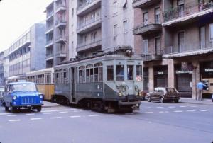 - Sur la photo prise le samedi 22 mai 1982, la motrice 92 Reggio Emilia (année 1937) et sa remorque voyageurs sont photographiées à Milan via Carlo-Farini alors qu’elles circulent en direction du terminus « Milan Via Vialtellina » commun aux lignes interurbaines vers Limbiate et Desio. Copyright : jean-pierre autié