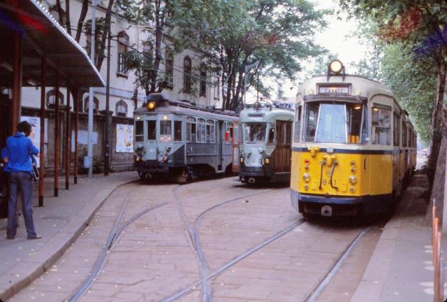 - A Milan, aux ateliers ATM de la via Teodosio, le samedi 22 mai 1982, photographie de la voiture pilote 540 en cours de rénovation dépendant du convoi fermé 500-A (année 1964) composé de la voiture pilote 539, de la motrice 505 Tallero et de la voiture pilote 540. Ce convoi fermé est toujours en service en 2020 sur la dernière ligne interurbaine milanaise « Comasina M3 » – « Limbiate ». Copyright : jean-pierre autié