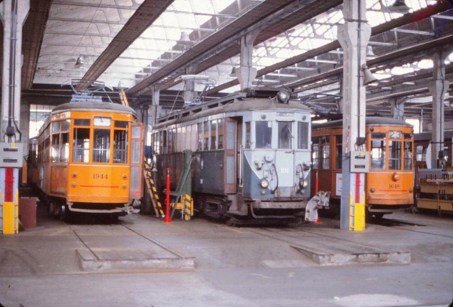 A Milan, aux ateliers ATM de la via Teodosio, au centre de la photo prise le samedi 22 mai 1982, la girouette de la motrice 101 Costamasnaga (année 1927) affiche « Vimercate » terminus de la ligne interurbaine « Milan Piazzale Sire Raul » – « Vimercate » définitivement fermée le dimanche 7 juin 1981. Copyright : jean-pierre autié