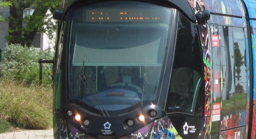 Aux manettes de la rame 2073 Citadis 402 Alstom, opérant sur la ligne 3 en direction du terminus « Pérols – Etang de l’Or », un conducteur TaM Montpellier 3M porte un masque de protection. Photo prise entre les stations « Pergola » et « Tonnelles », le samedi 25 avril 2020 à 12h18, 40e jour de confinement quasi total pour cause de pandémie de coronavirus Covid-19. Copyright : Edouard Paris