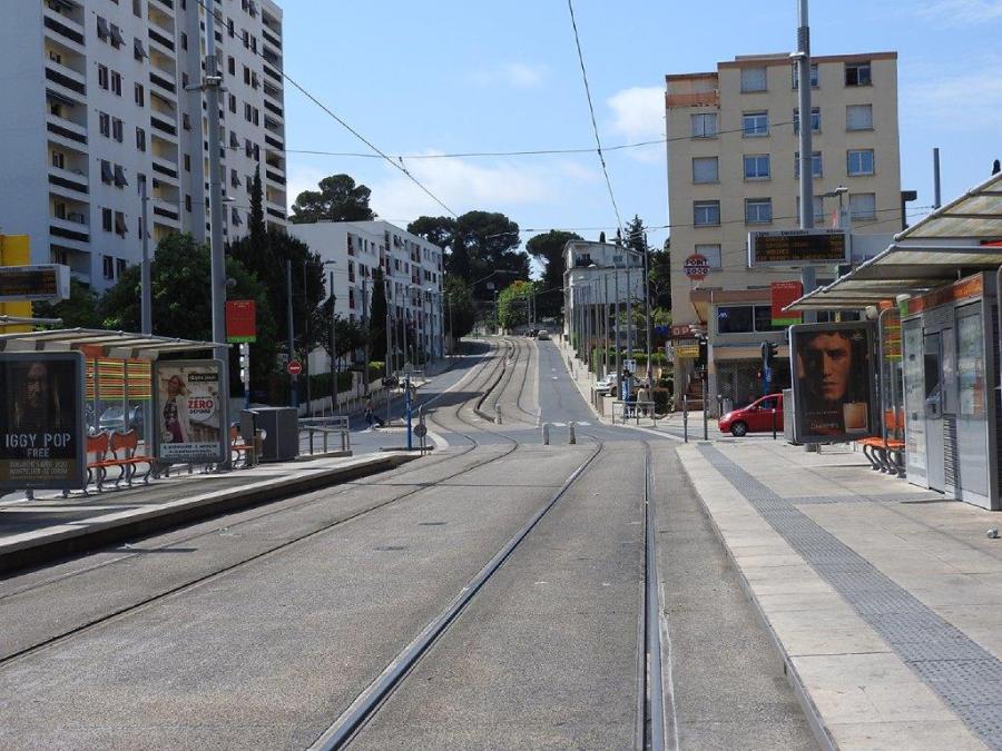 Dernier coup d’œil sur la station « Mas Drevon » de la ligne 2 au premier plan et sur la côte de l’avenue de Villeneuve d’Angoulême qui précède la station « Croix d’Argent » sur la même ligne, le dimanche 26 avril 2020, 41e jour de confinement pour cause de pandémie de coronavirus Covid-19. Copyright : Anje34