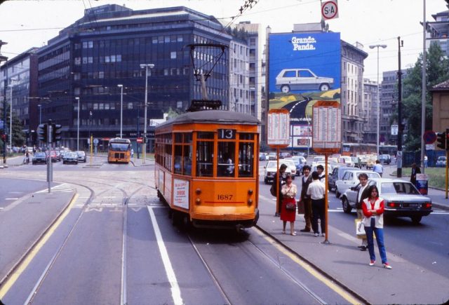 A Milan, le samedi 22 mai 1982, la motrice 1687 de la série 1500 Peter Witt est photographiée à l’arrêt « Larga » commun aux lignes 12, 13 et 23 de tramway et aux lignes 50, 54 et 60 de bus. Copyright : jean-pierre autié