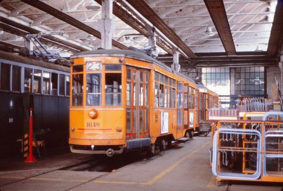 A Milan, la motrice 1648 de la série 1500 Peter Witt est photographiée sur une voie sur fosse des ateliers ATM de la via Teodosio, le samedi 22 mai 1982. Copyright : jean-pierre autié