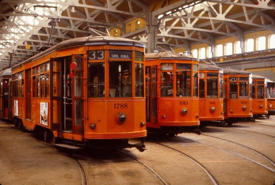 A Milan, motrice 1788 et nez des motrices 1913, 1811, 1932 et 1979 de la série 1500 Peter Witt photographiés sur les voies de garage du dépôt ATM « Leoncavallo », le samedi 22 mai 1982. Copyright : jean-pierre autié